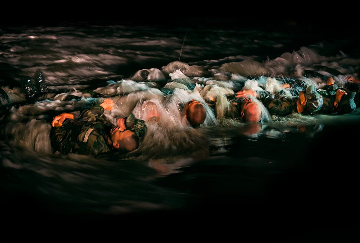 The loudspeaker keyed up, and a voice droned: “Forward march.” Another candidate broke the line and shuffled to the ambulance. The gap was silently filled with linked elbows. We marched into the cold water and let loose eerily loud exhales like whales breaching the surface and emptying their lungs. We laid down in a line and let the waves crash on our faces and bodies. Our locked arms prevented us from being thrown twenty feet at a time. The cold, the sand, the uncertainty, the pacing instructors, the seething sea in the dark—each made us hyper-aware of the legion of voices within our skulls; each of these voices attempted to gain supremacy of our minds; each of these voices made us turn inwards and ask ourselves, “Can I do 48 more hours of this? How is this even possible?”